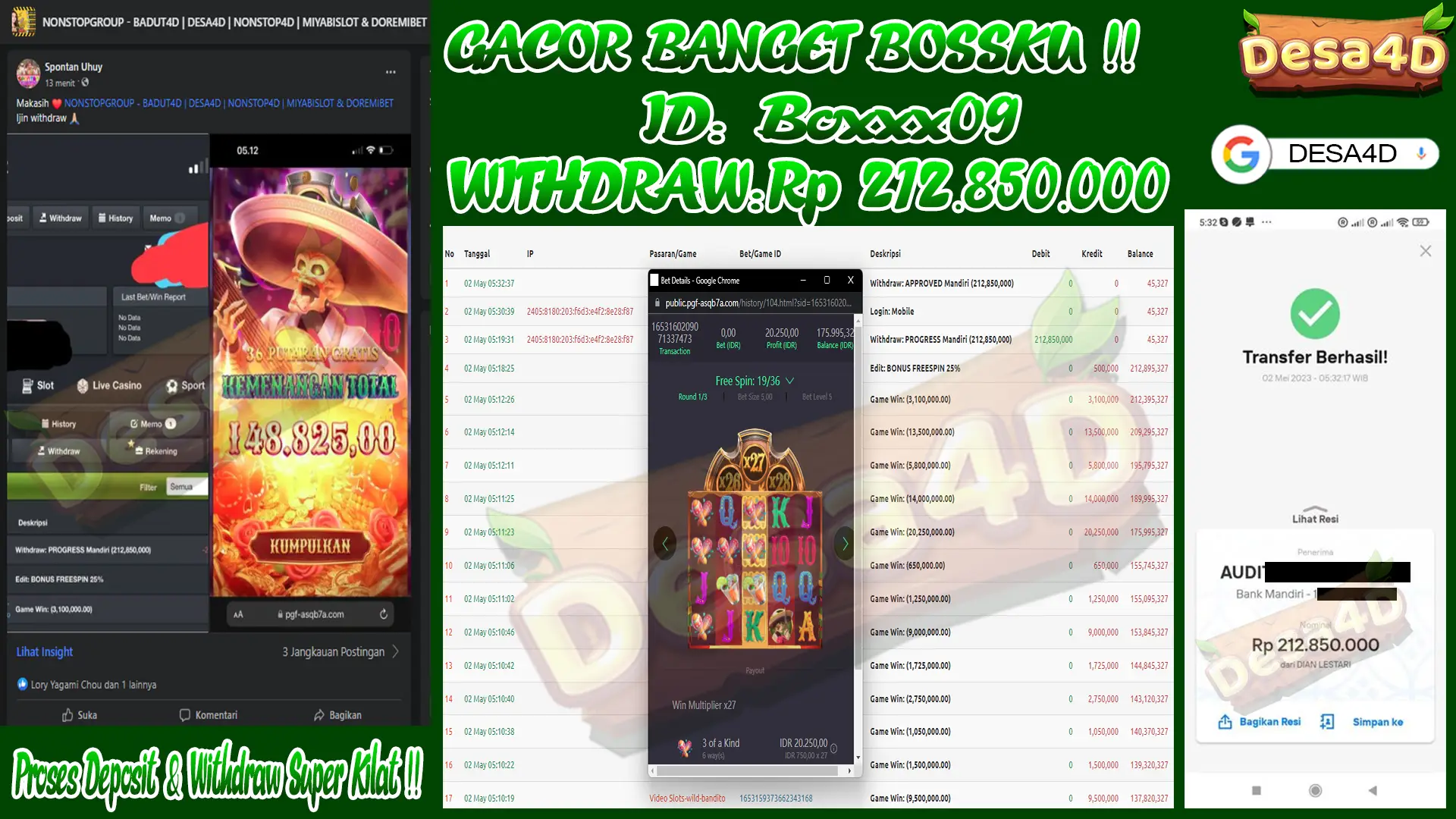 Selamat Kepada ID : BO***09 Atas Withdraw Rp. 212.850.000 Hari ini. Ditunggu Withdraw Selanjutnya dan ajak juga teman temannya bergabung di DESA4D