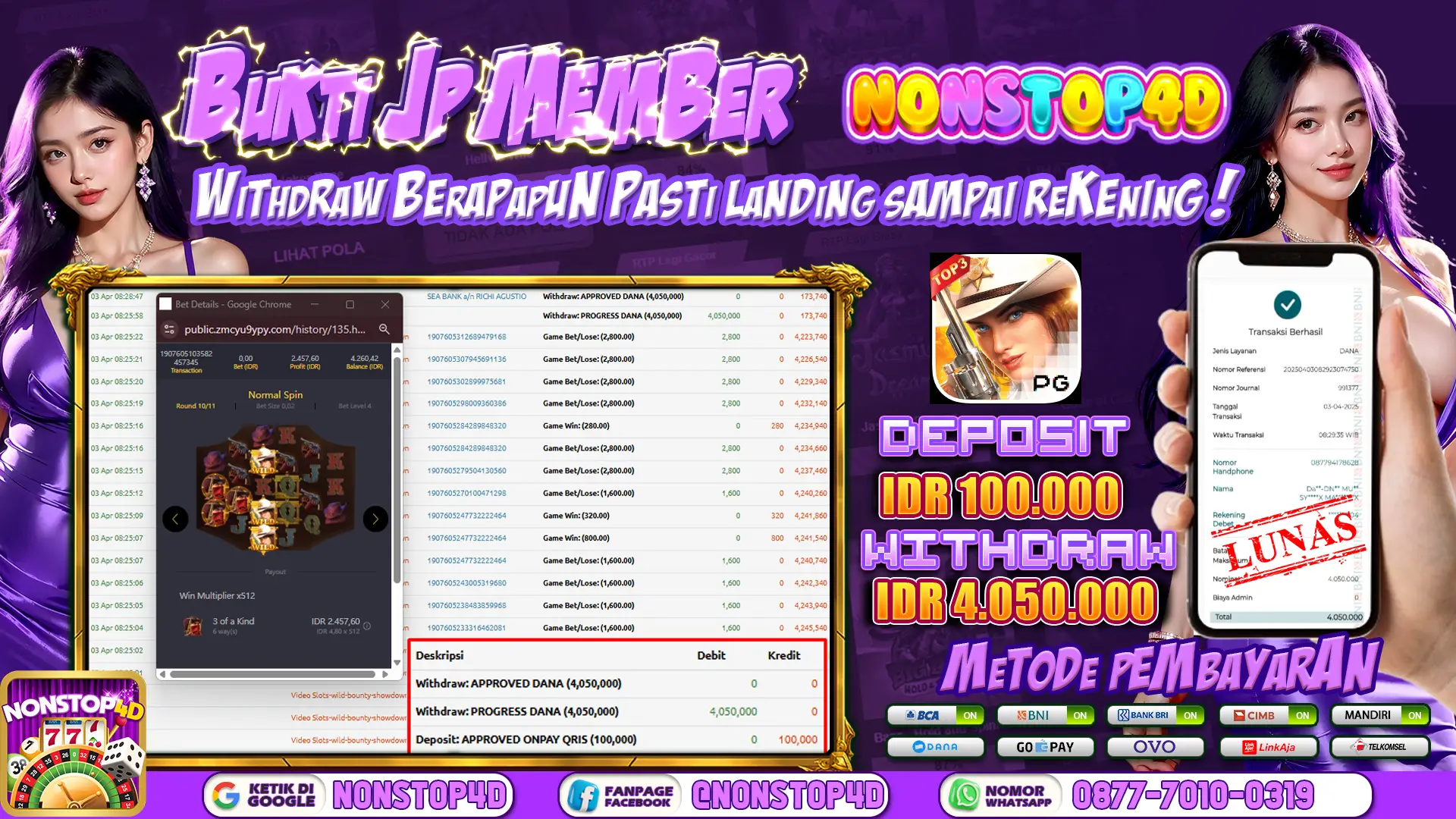 Tak hanya itu, kami juga menyediakan berbagai promo menarik, mulai dari bonus new member, cashback, hingga free spin setiap harinya! Sistem deposit dan withdraw kami cepat serta aman, didukung berbagai metode pembayaran termasuk e-wallet dan bank lokal. Bergabunglah sekarang dan rasakan sendiri keberuntungan Anda di NONSTOP4D Situs Slot Gacor 2025, di mana jackpot besar selalu siap menanti Anda!