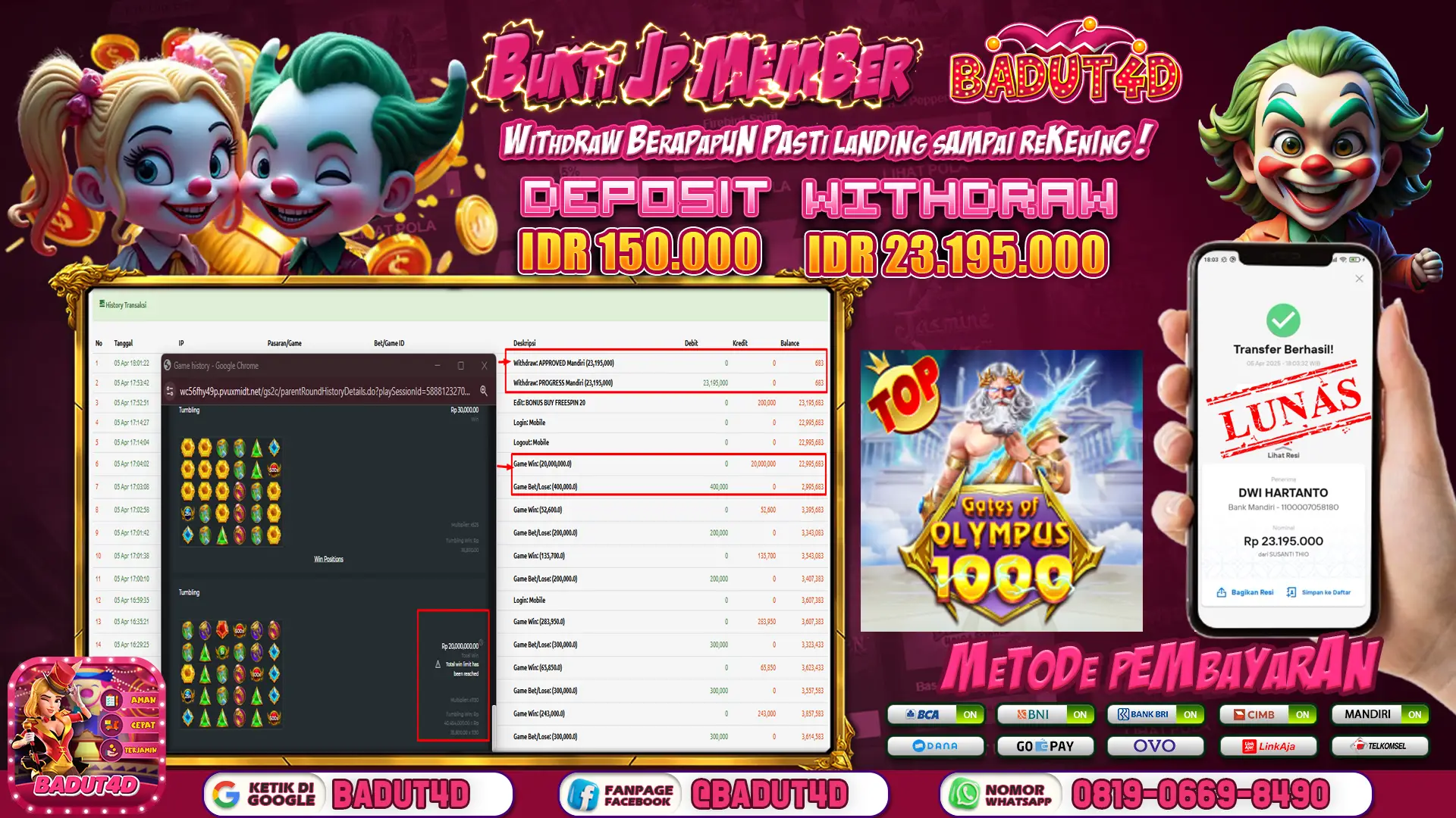 Selamat Kepada ID : D********O Atas Withdraw Rp. 23.195.000 Hari ini. Ditunggu Withdraw Selanjutnya dan ajak juga teman temannya bergabung di BADUT4D