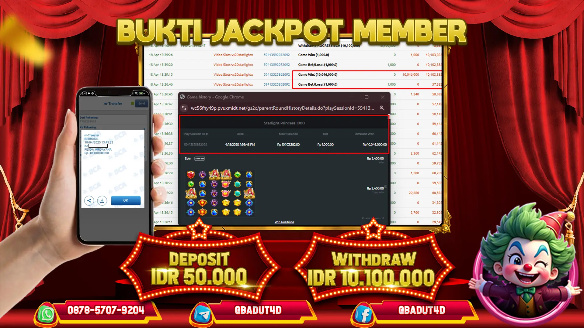 Selamat Kepada ID : R*******A Atas Withdraw Rp. 10.100.000 Hari ini. Ditunggu Withdraw Selanjutnya dan ajak juga teman temannya bergabung di BADUT4D