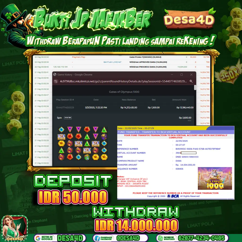 Selamat Kepada ID :S*******Y Atas Withdraw Rp. 14.000.000 Hari ini. Ditunggu Withdraw Selanjutnya dan ajak juga teman temannya bergabung di DESA4D