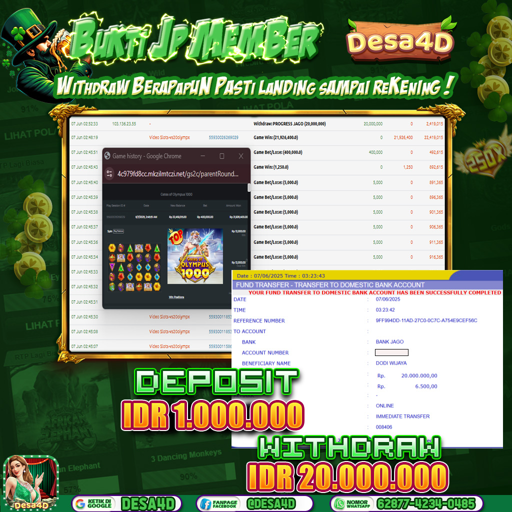 Selamat Kepada ID : KG****44 Atas Withdraw Rp. 20.000.000 Hari ini. Ditunggu Withdraw Selanjutnya dan ajak juga teman temannya bergabung di DESA4D