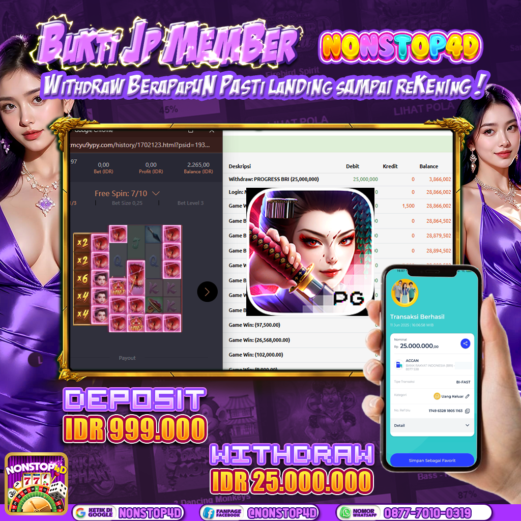 Tak hanya itu, kami juga menyediakan berbagai promo menarik, mulai dari bonus new member, cashback, hingga free spin setiap harinya! Sistem deposit dan withdraw kami cepat serta aman, didukung berbagai metode pembayaran termasuk e-wallet dan bank lokal. Bergabunglah sekarang dan rasakan sendiri keberuntungan Anda di NONSTOP4D Situs Slot Gacor 2025, di mana jackpot besar selalu siap menanti Anda!