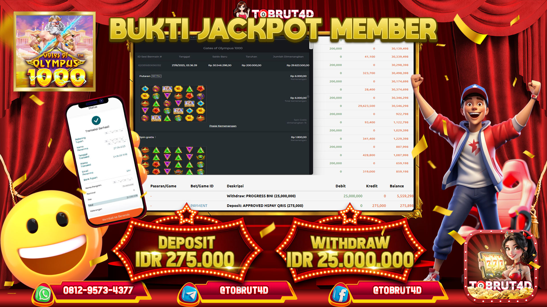 Selamat Kepada ID : P****M Telah berhasil mendapatkan kemenangan besar pada permainan GATES OF OLYMPUS 1000 kemenangan Sebesar 25.000.000,Setelah mengisi formulir withdraw dengan kurung waktu hanya 5 – 10 menit pihak tobrut4d sudah melakukan transfer kepada pemilik Userid dan dana sudah dapat di cairkan oleh pemenang. Bukti pembayaran yang kami berikan merupakan bukti pembayaran yang SAH / VALID yang langung di dapatkan melaui tanda transfer transaksi dari Bank yang di tuju.