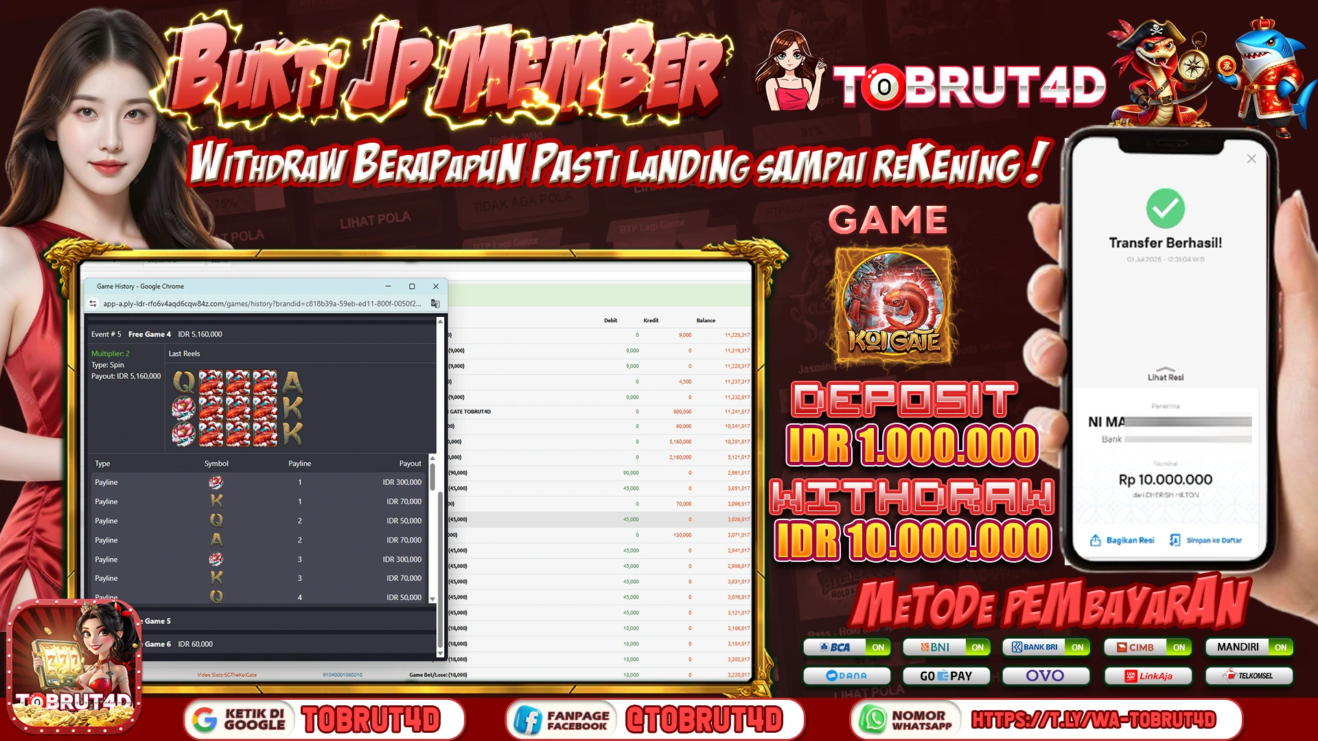 Selamat Kepada ID : J****69 Telah berhasil mendapatkan kemenangan besar pada permainan KOI GATE kemenangan Sebesar 10.000.000,Setelah mengisi formulir withdraw dengan kurung waktu hanya 5 – 10 menit pihak tobrut4d sudah melakukan transfer kepada pemilik Userid dan dana sudah dapat di cairkan oleh pemenang. Bukti pembayaran yang kami berikan merupakan bukti pembayaran yang SAH / VALID yang langung di dapatkan melaui tanda transfer transaksi dari Bank yang di tuju.