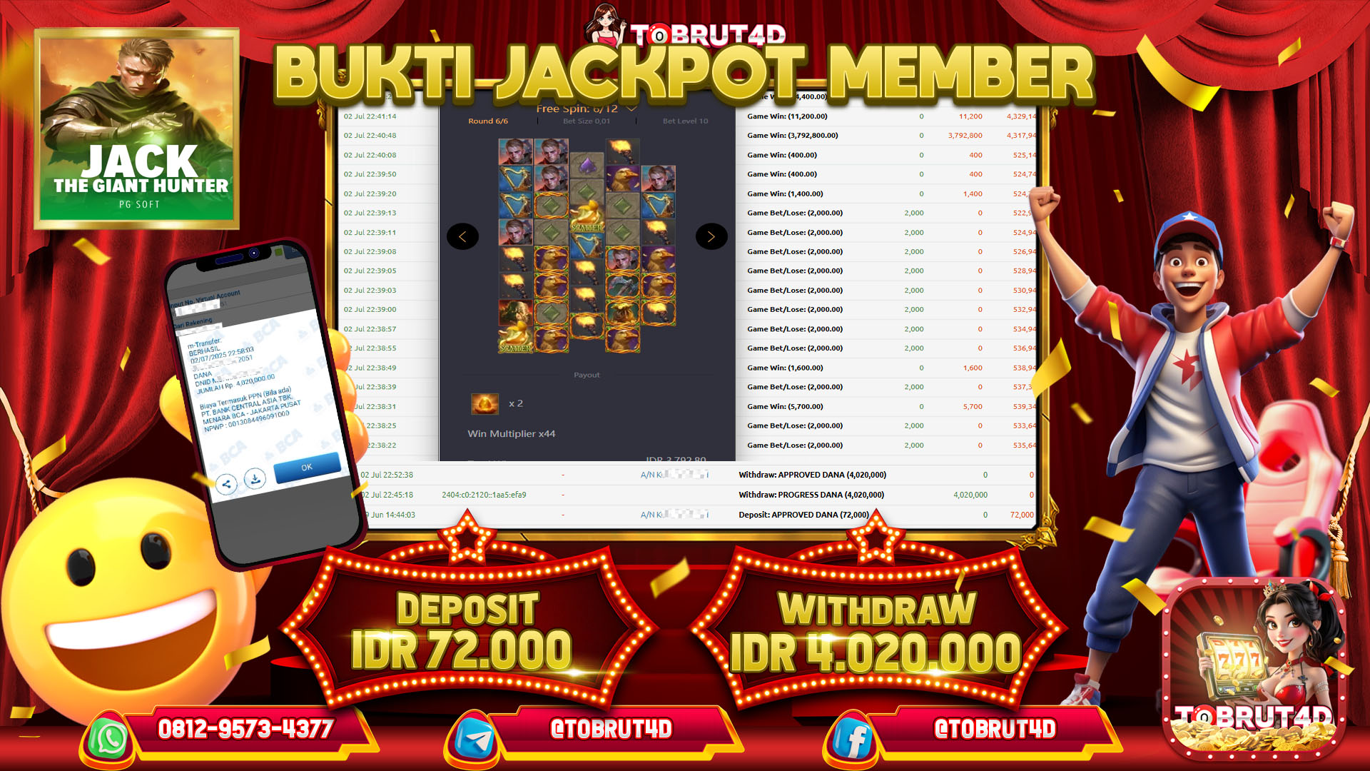 Selamat Kepada ID : K*****4 Telah berhasil mendapatkan kemenangan besar pada permainan JACK THE GIANT HUNTER kemenangan Sebesar 4.020.000,Setelah mengisi formulir withdraw dengan kurung waktu hanya 5 – 10 menit pihak tobrut4d sudah melakukan transfer kepada pemilik Userid dan dana sudah dapat di cairkan oleh pemenang. Bukti pembayaran yang kami berikan merupakan bukti pembayaran yang SAH / VALID yang langung di dapatkan melaui tanda transfer transaksi dari Bank yang di tuju.