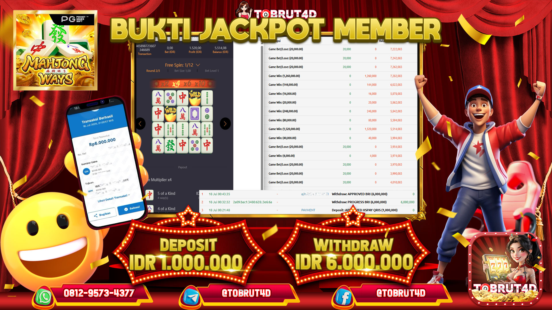 Selamat Kepada ID : N*****M Telah berhasil mendapatkan kemenangan besar pada permainan MAHJONG WAYS 1 kemenangan Sebesar 6.000.000,Setelah mengisi formulir withdraw dengan kurung waktu hanya 5 – 10 menit pihak tobrut4d sudah melakukan transfer kepada pemilik Userid dan dana sudah dapat di cairkan oleh pemenang. Bukti pembayaran yang kami berikan merupakan bukti pembayaran yang SAH / VALID yang langung di dapatkan melaui tanda transfer transaksi dari Bank yang di tuju.