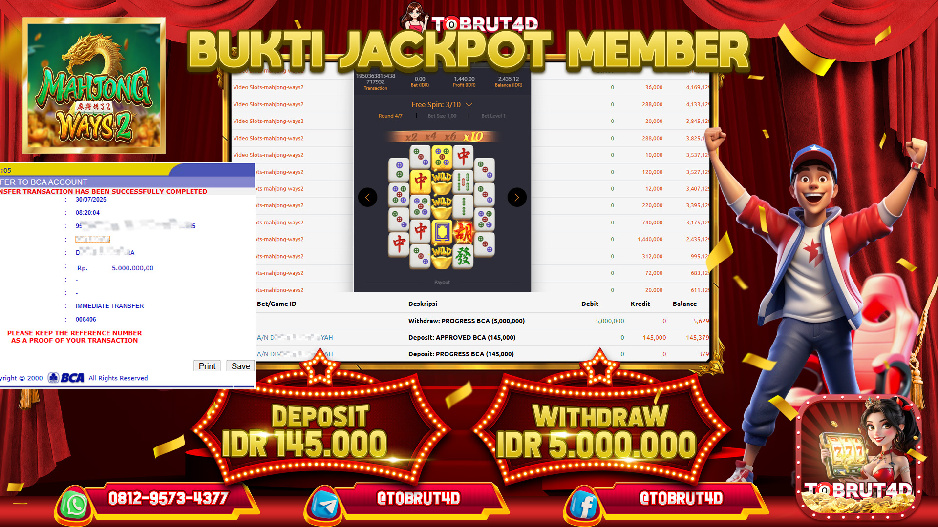 Selamat Kepada ID : HO*****M Telah berhasil mendapatkan kemenangan besar pada permainan MAHJONG WAYS 2 kemenangan Sebesar 5.000.000,Setelah mengisi formulir withdraw dengan kurung waktu hanya 5 – 10 menit pihak tobrut4d sudah melakukan transfer kepada pemilik Userid dan dana sudah dapat di cairkan oleh pemenang. Bukti pembayaran yang kami berikan merupakan bukti pembayaran yang SAH / VALID yang langung di dapatkan melaui tanda transfer transaksi dari Bank yang di tuju.