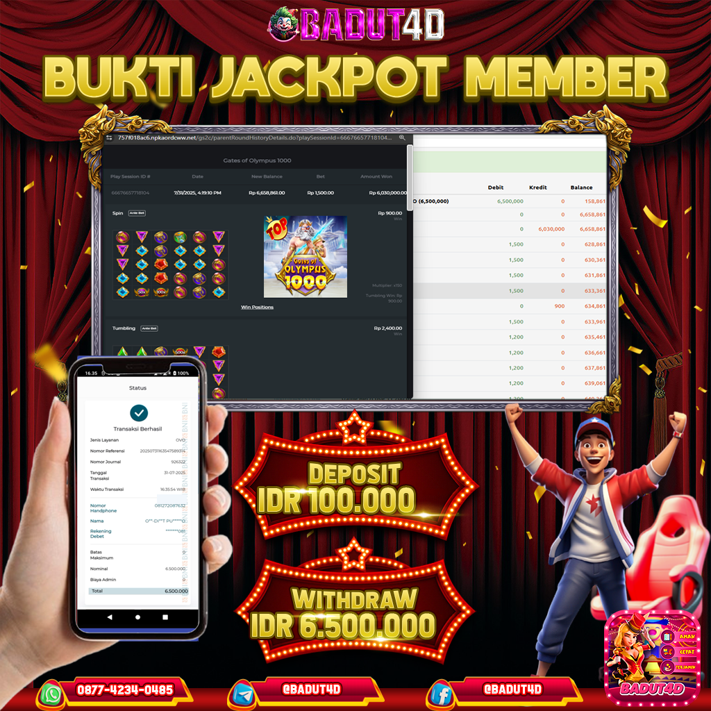 Selamat kepada ID : RU***21 Atas Withdraw Rp. 6.500.000 Hari ini. Ditunggu withdraw selanjutnya dan ajak juga teman temannya bergabung di BADUT4D