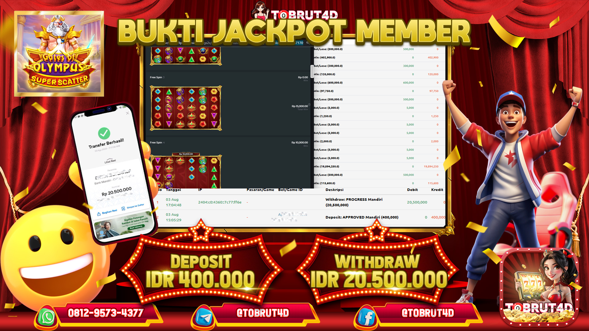 Selamat Kepada ID : V*****412 Telah berhasil mendapatkan kemenangan besar pada permainan GATES OF OLYMPUS SUPER SCATTER kemenangan Sebesar 20.500.000,Setelah mengisi formulir withdraw dengan kurung waktu hanya 5 – 10 menit pihak tobrut4d sudah melakukan transfer kepada pemilik Userid dan dana sudah dapat di cairkan oleh pemenang. Bukti pembayaran yang kami berikan merupakan bukti pembayaran yang SAH / VALID yang langung di dapatkan melaui tanda transfer transaksi dari Bank yang di tuju.