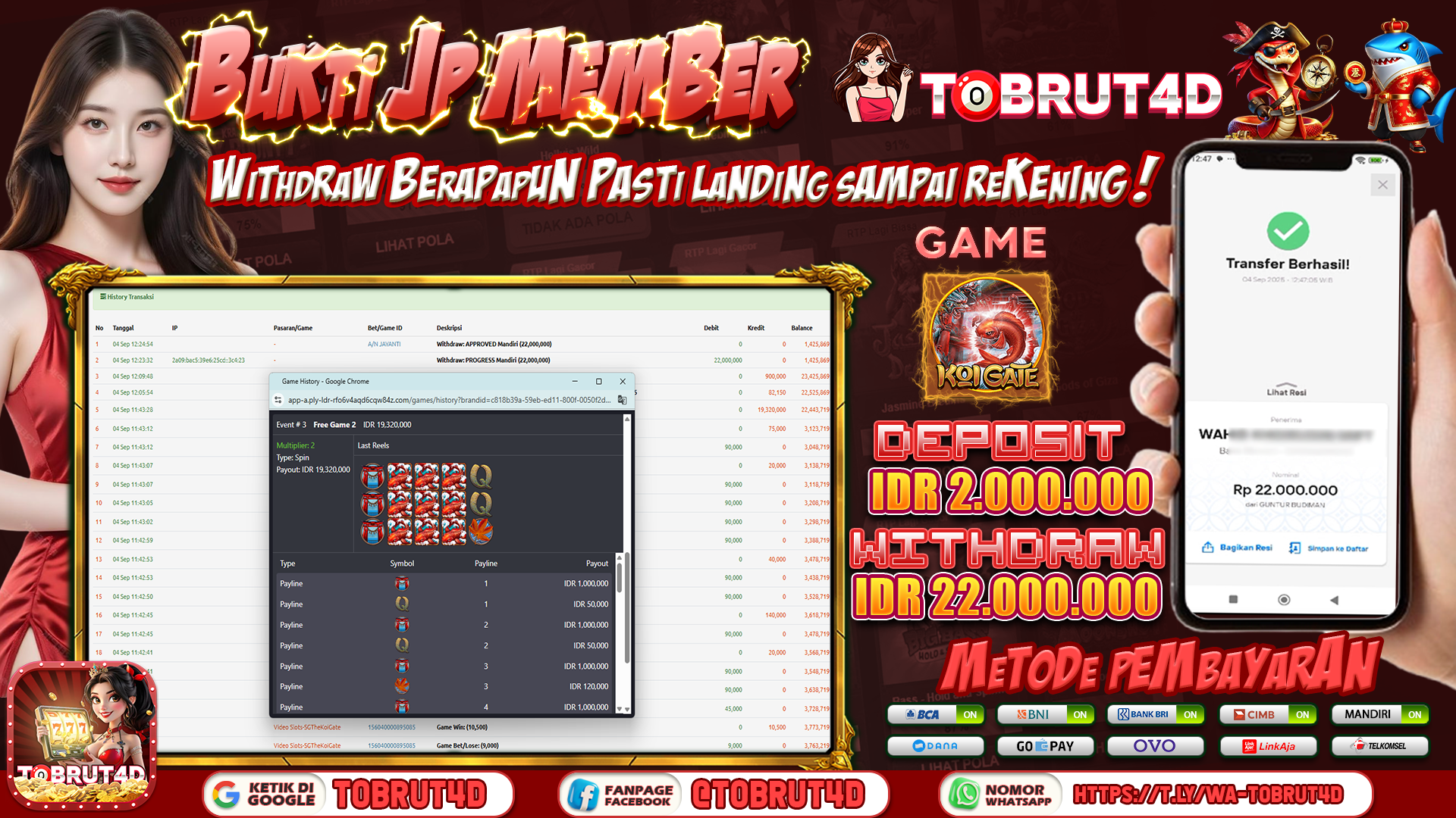 Selamat Kepada ID :T***111 Telah berhasil mendapatkan kemenangan besar pada permainan KOI GATE kemenangan Sebesar 22.000.000,Setelah mengisi formulir withdraw dengan kurung waktu hanya 5 – 10 menit pihak tobrut4d sudah melakukan transfer kepada pemilik Userid dan dana sudah dapat di cairkan oleh pemenang. Bukti pembayaran yang kami berikan merupakan bukti pembayaran yang SAH / VALID yang langung di dapatkan melaui tanda transfer transaksi dari Bank yang di tuju.
