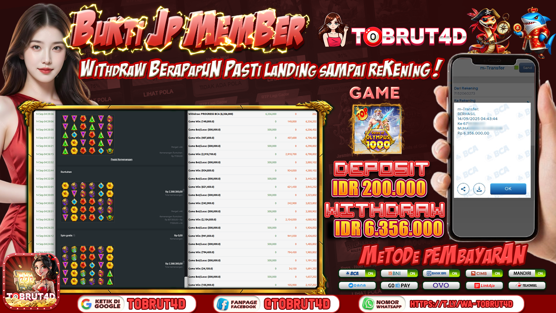 Selamat Kepada ID :K****458 Telah berhasil mendapatkan kemenangan besar pada permainan GATES OF OLYMPUS 1000 kemenangan Sebesar 6.356.000,Setelah mengisi formulir withdraw dengan kurung waktu hanya 5 – 10 menit pihak tobrut4d sudah melakukan transfer kepada pemilik Userid dan dana sudah dapat di cairkan oleh pemenang. Bukti pembayaran yang kami berikan merupakan bukti pembayaran yang SAH / VALID yang langung di dapatkan melaui tanda transfer transaksi dari Bank yang di tuju.