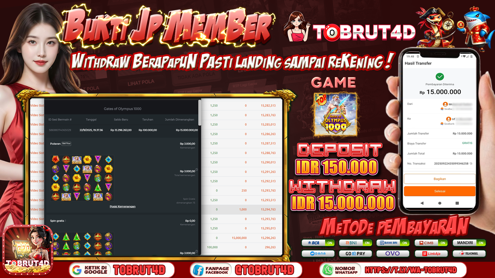 Selamat Kepada ID :RE****07 Telah berhasil mendapatkan kemenangan besar pada permainan GATES OF OLYMPUS 1000 kemenangan Sebesar 15.000.000,Setelah mengisi formulir withdraw dengan kurung waktu hanya 5 – 10 menit pihak tobrut4d sudah melakukan transfer kepada pemilik Userid dan dana sudah dapat di cairkan oleh pemenang. Bukti pembayaran yang kami berikan merupakan bukti pembayaran yang SAH / VALID yang langung di dapatkan melaui tanda transfer transaksi dari Bank yang di tuju.