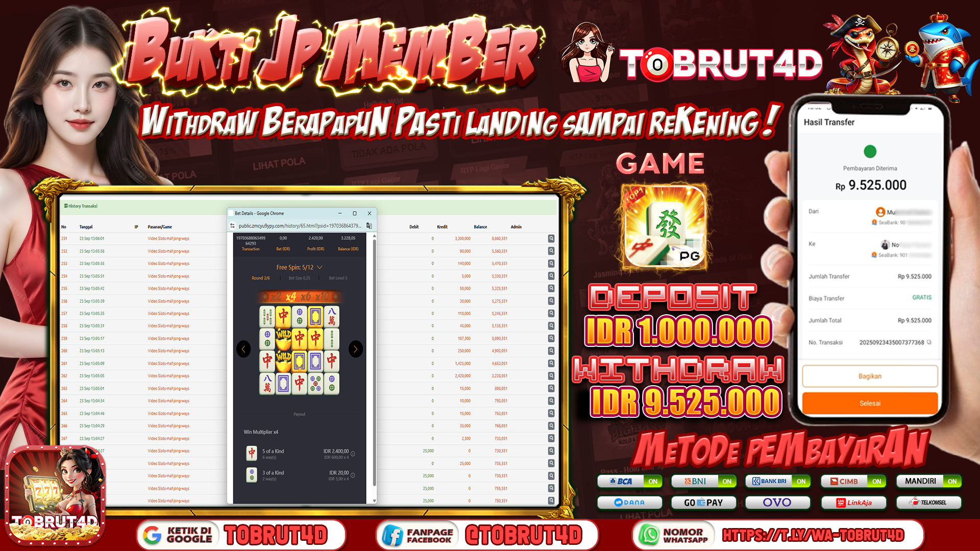 Selamat Kepada ID :BA****M Telah berhasil mendapatkan kemenangan besar pada permainan MAHJONG WAYS 1 kemenangan Sebesar 9.525.000,Setelah mengisi formulir withdraw dengan kurung waktu hanya 5 – 10 menit pihak tobrut4d sudah melakukan transfer kepada pemilik Userid dan dana sudah dapat di cairkan oleh pemenang. Bukti pembayaran yang kami berikan merupakan bukti pembayaran yang SAH / VALID yang langung di dapatkan melaui tanda transfer transaksi dari Bank yang di tuju.