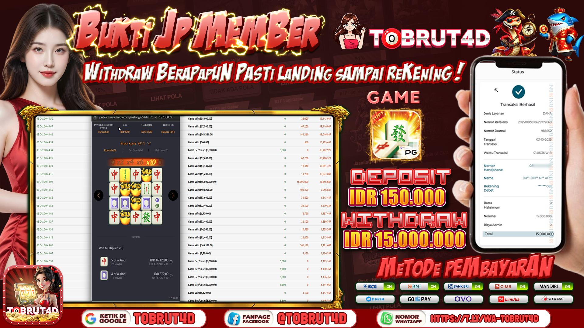 Selamat Kepada ID :L****GG Telah berhasil mendapatkan kemenangan besar pada permainan MAHJONG WAYS 1 kemenangan Sebesar 15.000.000,Setelah mengisi formulir withdraw dengan kurung waktu hanya 5 – 10 menit pihak tobrut4d sudah melakukan transfer kepada pemilik Userid dan dana sudah dapat di cairkan oleh pemenang. Bukti pembayaran yang kami berikan merupakan bukti pembayaran yang SAH / VALID yang langung di dapatkan melaui tanda transfer transaksi dari Bank yang di tuju.