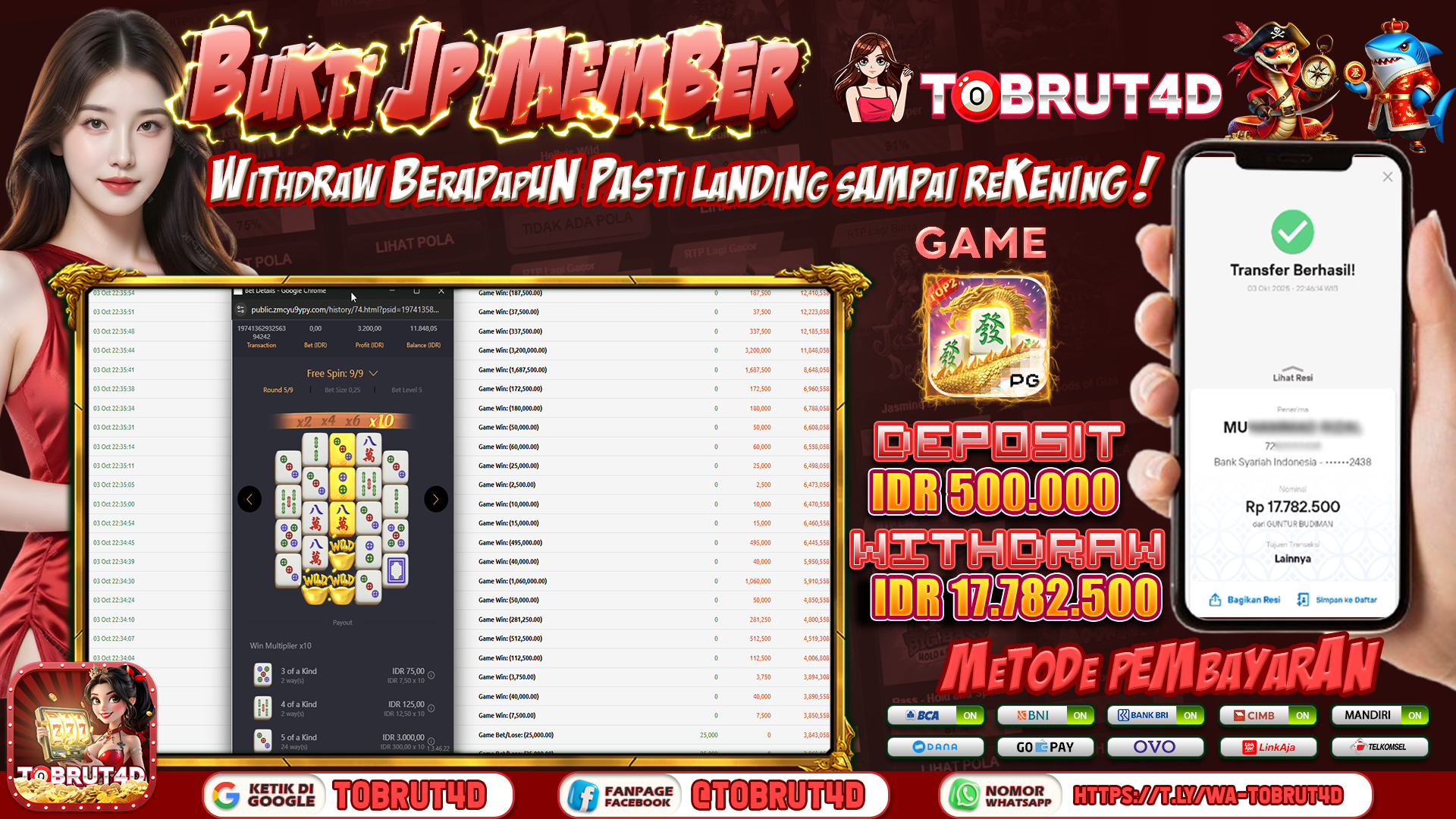 Selamat Kepada ID :A****E Telah berhasil mendapatkan kemenangan besar pada permainan MAHJONG WAYS 2 kemenangan Sebesar 17.782.500,Setelah mengisi formulir withdraw dengan kurung waktu hanya 5 – 10 menit pihak tobrut4d sudah melakukan transfer kepada pemilik Userid dan dana sudah dapat di cairkan oleh pemenang. Bukti pembayaran yang kami berikan merupakan bukti pembayaran yang SAH / VALID yang langung di dapatkan melaui tanda transfer transaksi dari Bank yang di tuju.