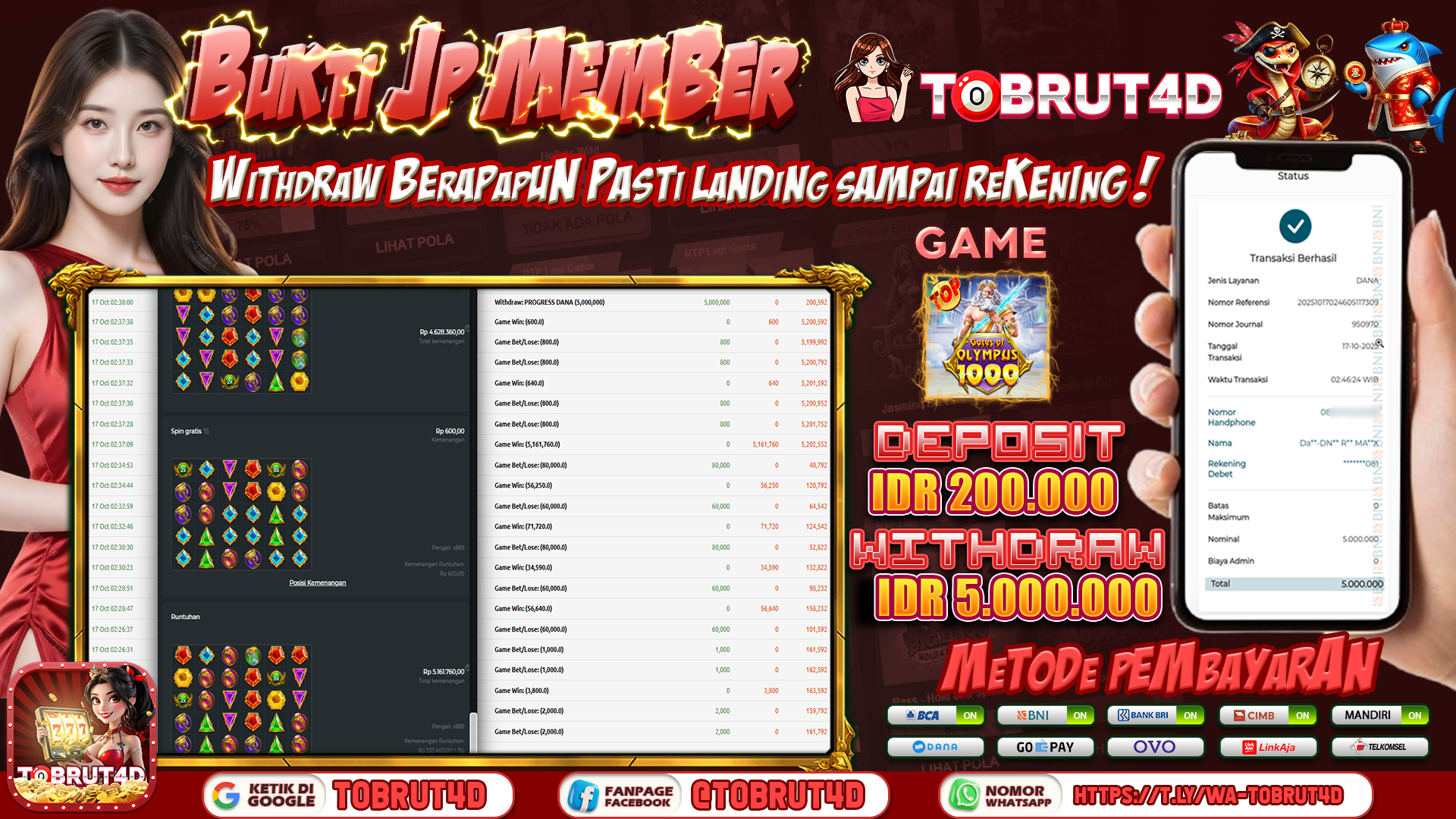 Selamat Kepada ID :R*****12 Telah berhasil mendapatkan kemenangan besar pada permainan GATES OF OLYMPUS 1000 kemenangan Sebesar 5.000.000,Setelah mengisi formulir withdraw dengan kurung waktu hanya 5 – 10 menit pihak tobrut4d sudah melakukan transfer kepada pemilik Userid dan dana sudah dapat di cairkan oleh pemenang. Bukti pembayaran yang kami berikan merupakan bukti pembayaran yang SAH / VALID yang langung di dapatkan melaui tanda transfer transaksi dari Bank yang di tuju.