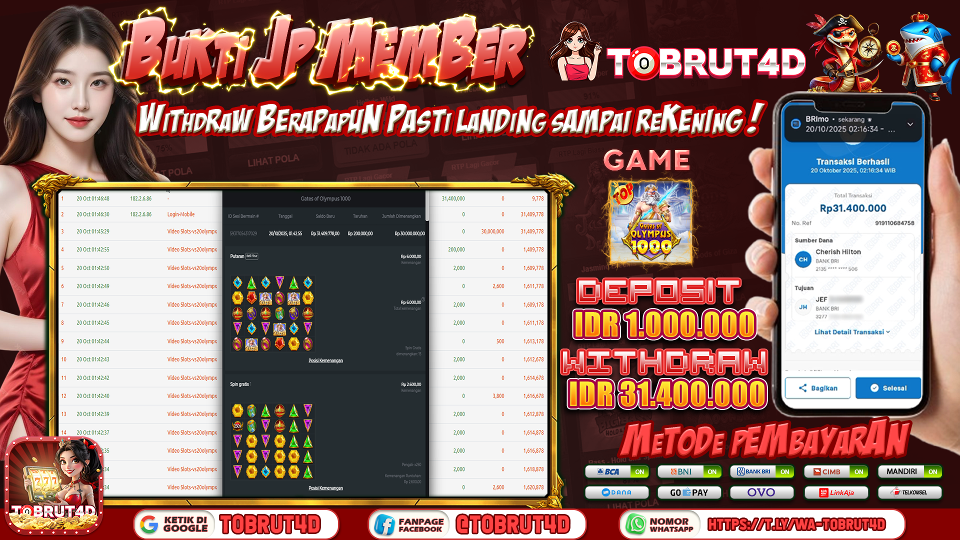 Selamat Kepada ID :S****JP Telah berhasil mendapatkan kemenangan besar pada permainan GATES OF OLYMPUS 1000 kemenangan Sebesar 31.400.000,Setelah mengisi formulir withdraw dengan kurung waktu hanya 5 – 10 menit pihak tobrut4d sudah melakukan transfer kepada pemilik Userid dan dana sudah dapat di cairkan oleh pemenang. Bukti pembayaran yang kami berikan merupakan bukti pembayaran yang SAH / VALID yang langung di dapatkan melaui tanda transfer transaksi dari Bank yang di tuju.