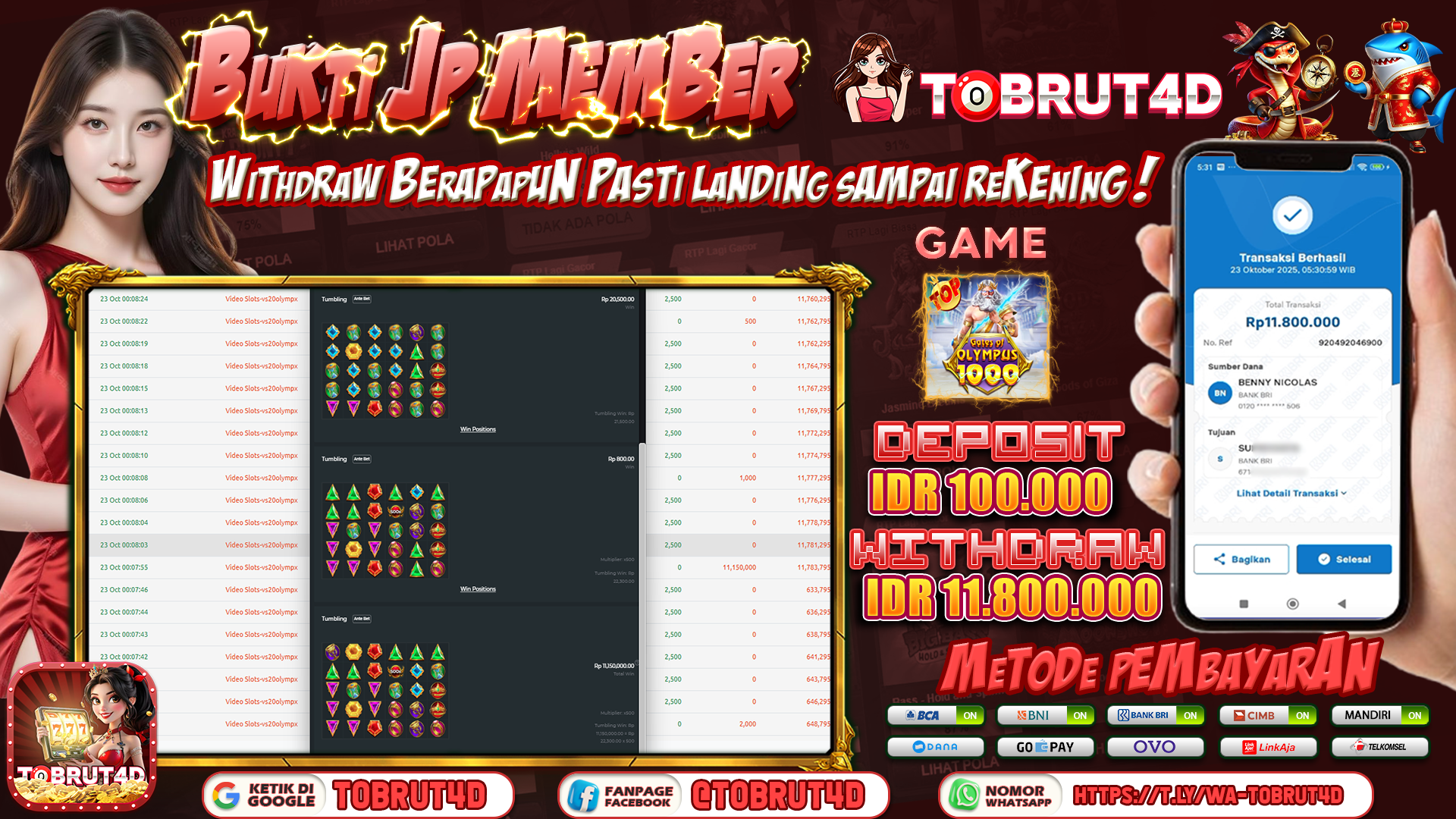 Selamat Kepada ID :A****86 Telah berhasil mendapatkan kemenangan besar pada permainan GATES OF OLYMPUS 1000 kemenangan Sebesar 11.800.000,Setelah mengisi formulir withdraw dengan kurung waktu hanya 5 – 10 menit pihak tobrut4d sudah melakukan transfer kepada pemilik Userid dan dana sudah dapat di cairkan oleh pemenang. Bukti pembayaran yang kami berikan merupakan bukti pembayaran yang SAH / VALID yang langung di dapatkan melaui tanda transfer transaksi dari Bank yang di tuju.