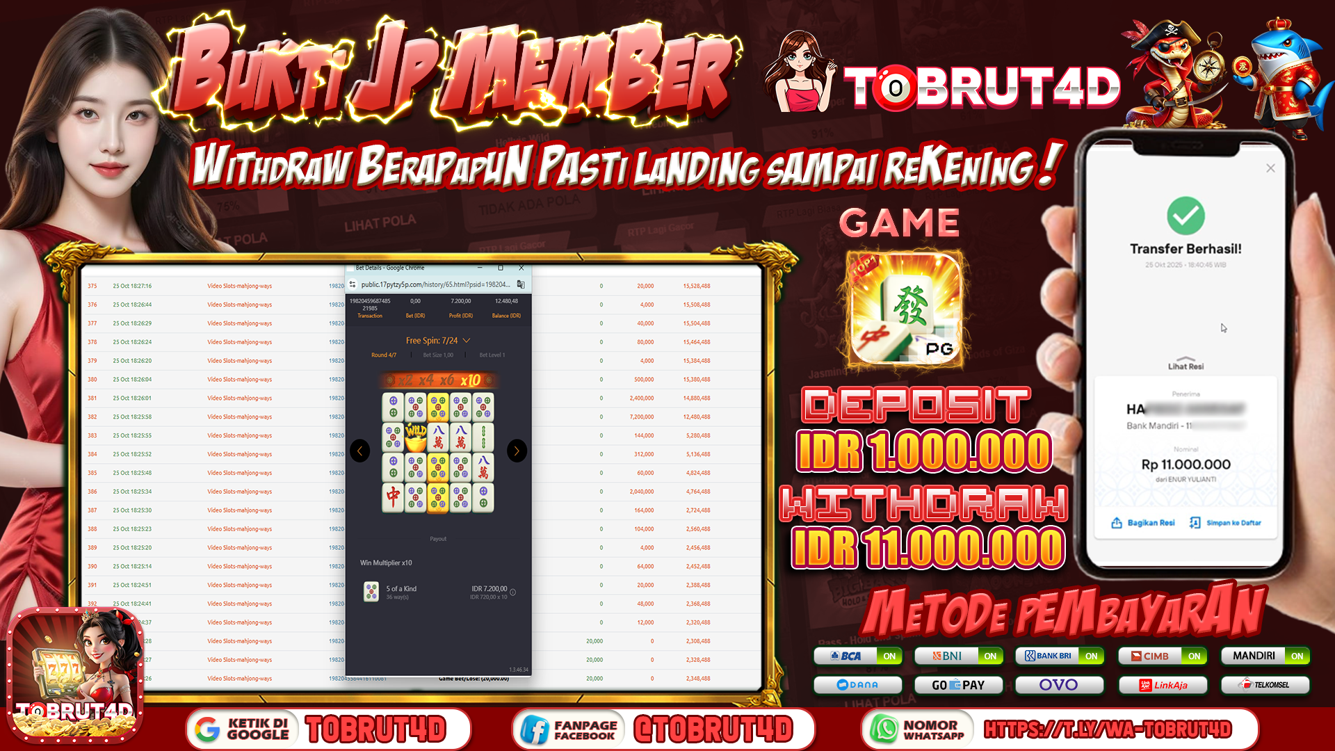 Selamat Kepada ID :S****M Telah berhasil mendapatkan kemenangan besar pada permainan MAHJONG WAYS 1 kemenangan Sebesar 11.000.000,Setelah mengisi formulir withdraw dengan kurung waktu hanya 5 – 10 menit pihak tobrut4d sudah melakukan transfer kepada pemilik Userid dan dana sudah dapat di cairkan oleh pemenang. Bukti pembayaran yang kami berikan merupakan bukti pembayaran yang SAH / VALID yang langung di dapatkan melaui tanda transfer transaksi dari Bank yang di tuju.