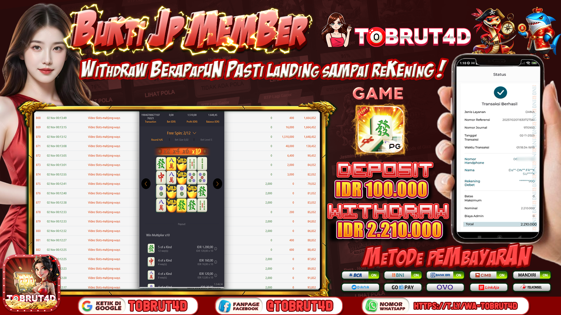 Selamat Kepada ID :H****01 Telah berhasil mendapatkan kemenangan besar pada permainan MAHJONG WAYS 1 kemenangan Sebesar 2.210.000,Setelah mengisi formulir withdraw dengan kurung waktu hanya 5 – 10 menit pihak tobrut4d sudah melakukan transfer kepada pemilik Userid dan dana sudah dapat di cairkan oleh pemenang. Bukti pembayaran yang kami berikan merupakan bukti pembayaran yang SAH / VALID yang langung di dapatkan melaui tanda transfer transaksi dari Bank yang di tuju.