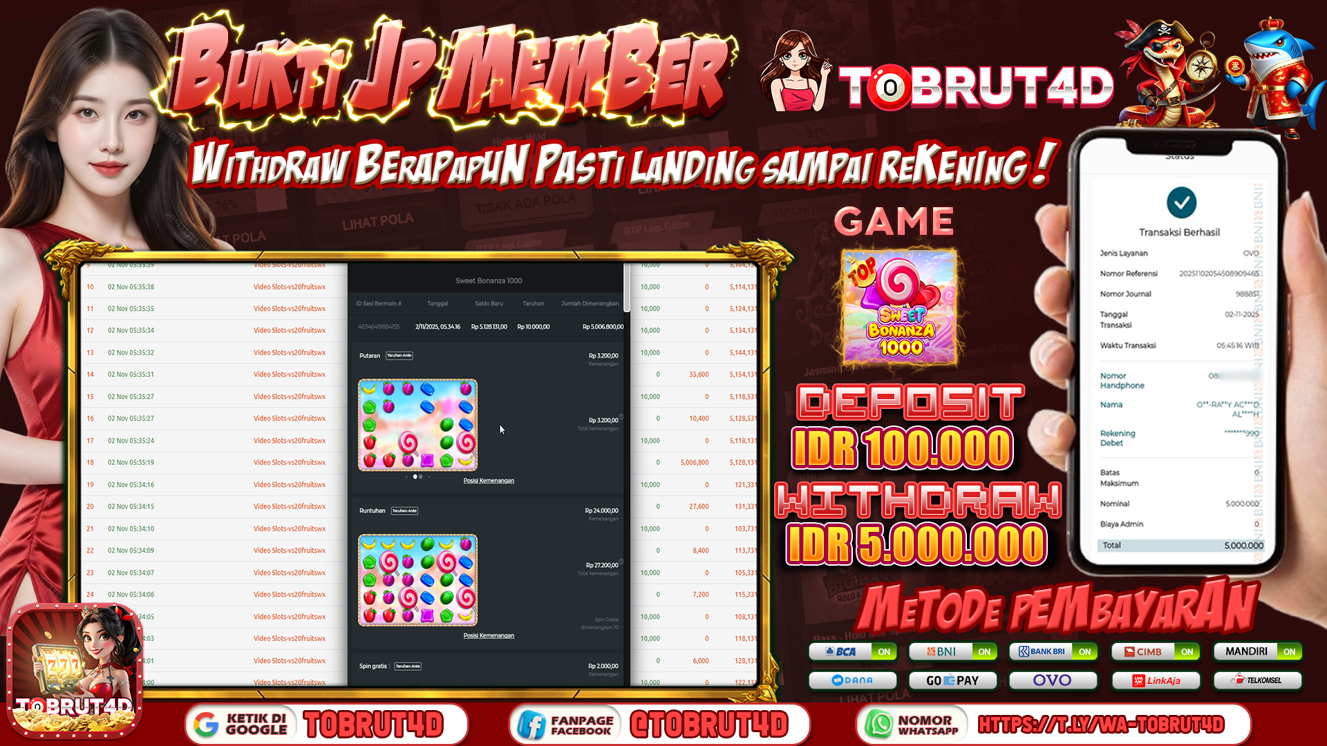 Selamat Kepada ID :B****123 Telah berhasil mendapatkan kemenangan besar pada permainan SWEET BONANZA 1000 kemenangan Sebesar 5.000.000,Setelah mengisi formulir withdraw dengan kurung waktu hanya 5 – 10 menit pihak tobrut4d sudah melakukan transfer kepada pemilik Userid dan dana sudah dapat di cairkan oleh pemenang. Bukti pembayaran yang kami berikan merupakan bukti pembayaran yang SAH / VALID yang langung di dapatkan melaui tanda transfer transaksi dari Bank yang di tuju.