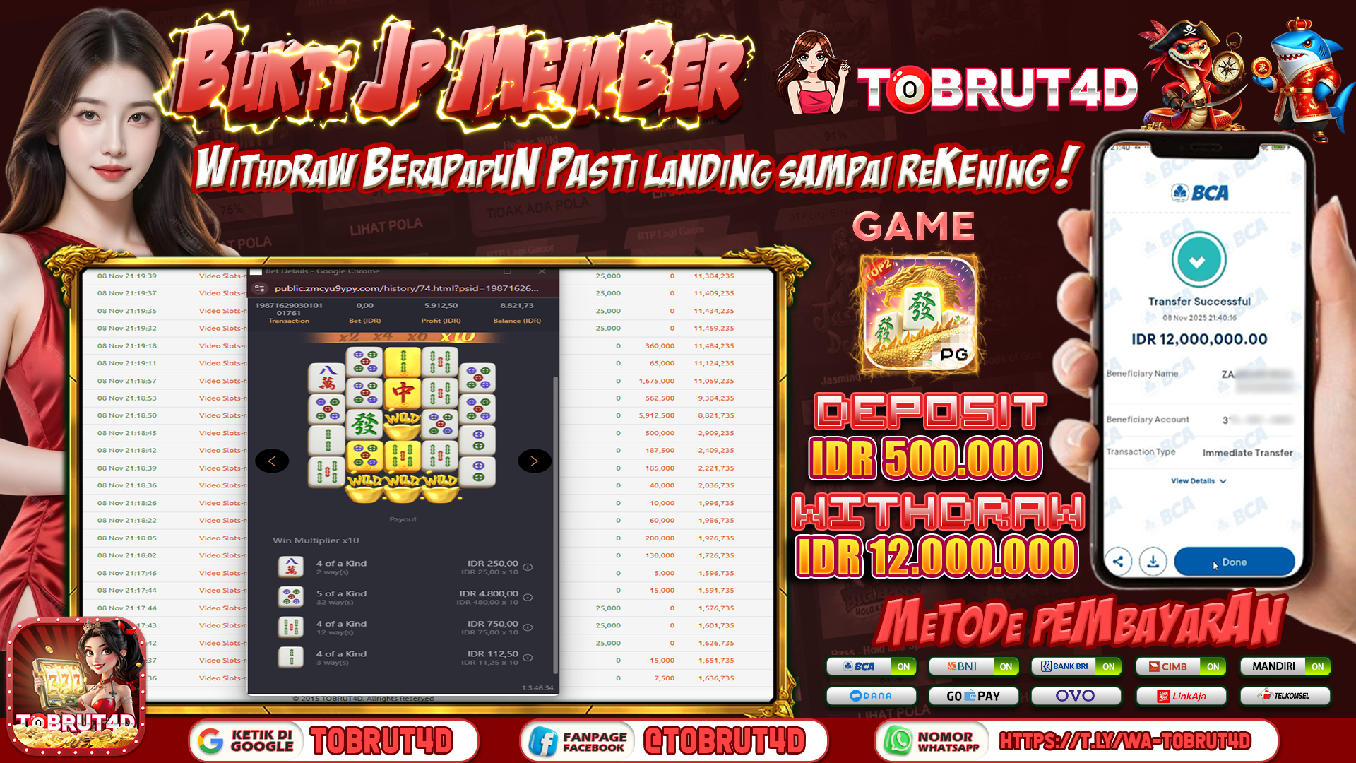 Selamat Kepada ID :E*****O Telah berhasil mendapatkan kemenangan besar pada permainan MAHJONG WAYS 2 kemenangan Sebesar 12.000.000,Setelah mengisi formulir withdraw dengan kurung waktu hanya 5 – 10 menit pihak tobrut4d sudah melakukan transfer kepada pemilik Userid dan dana sudah dapat di cairkan oleh pemenang. Bukti pembayaran yang kami berikan merupakan bukti pembayaran yang SAH / VALID yang langung di dapatkan melaui tanda transfer transaksi dari Bank yang di tuju.
